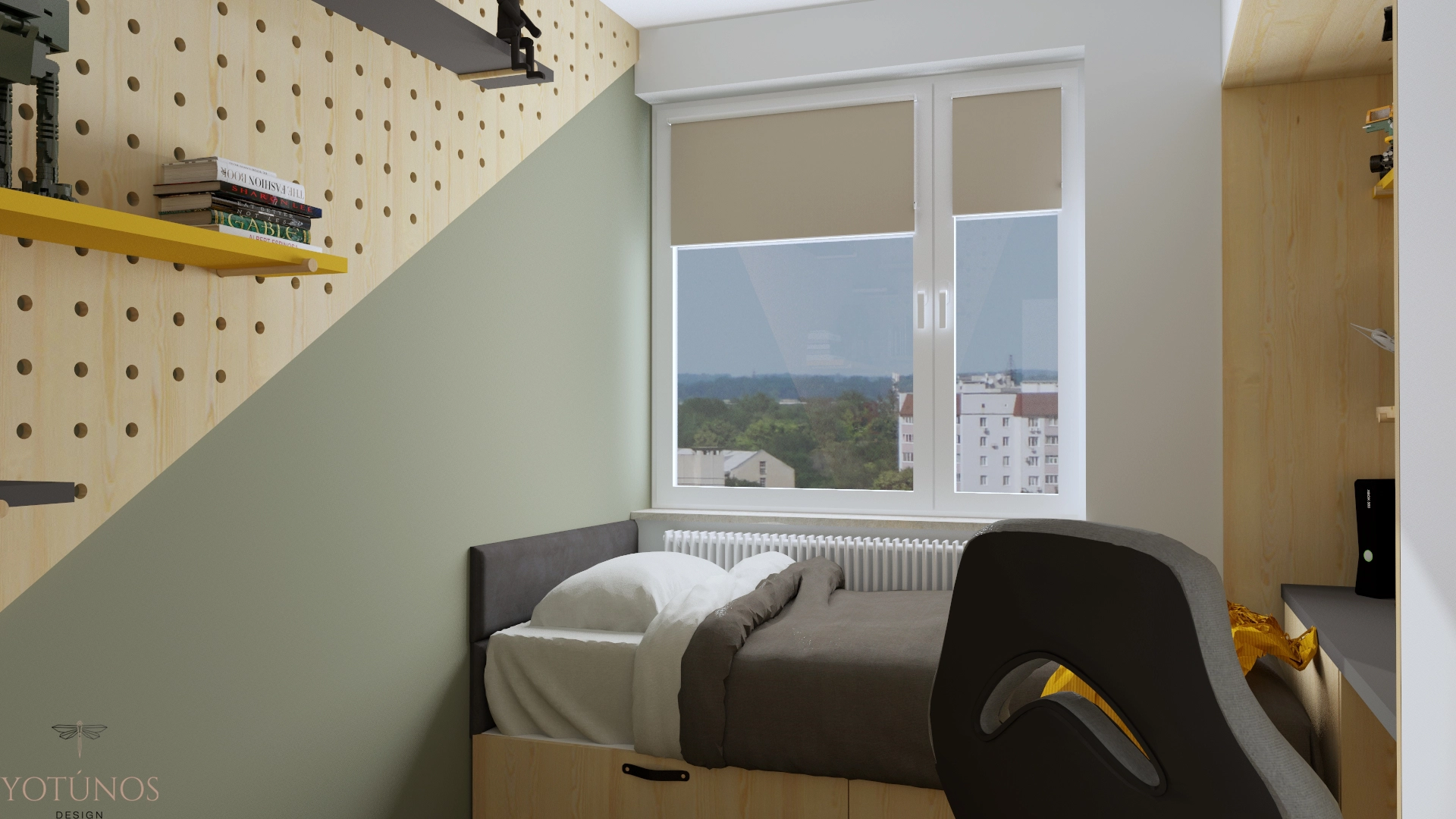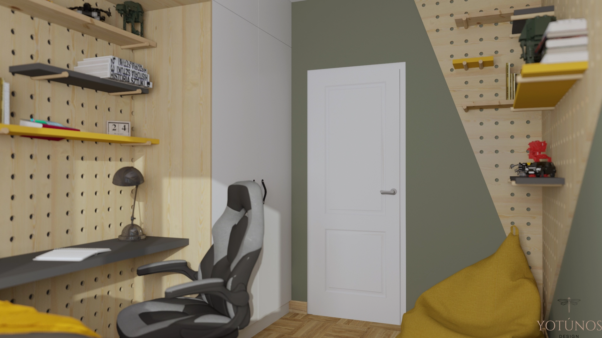 53 metry, wielka płyta – i projekt, który nie daje po sobie poznać ani jednego, ani drugiego. Salon cichy i dopracowany, z botanicznymi plakatami i miękką sofą. Pokój Mateusza głośny i pełen energii – pegboard, żółty akcent, oliwkowa ściana na skos i wszystkie skarby ustawione na półkach. Blok z klasą, bo klasa nie zna metrażu.
