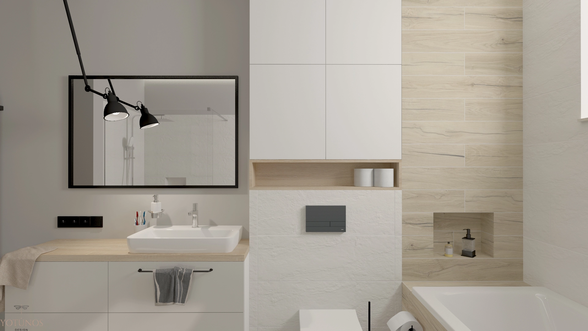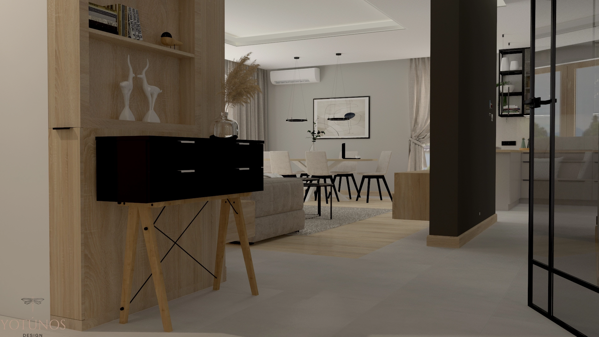 Dom, w którym czerń nie chłodzi – ona otula. Stalowe ramy, czarne detale i przeszklona biblioteka przy kominku tworzą wyrazisty charakter, który drewno i beże zamieniają w coś zaskakująco przytulnego. Nowoczesny styl z duszą – dla rodziny, która lubi mieć wszystko pod ręką, łącznie z dobrą książką.