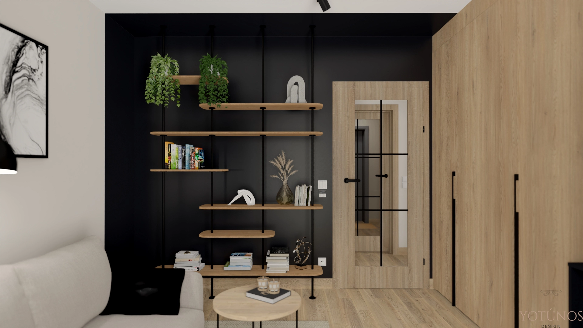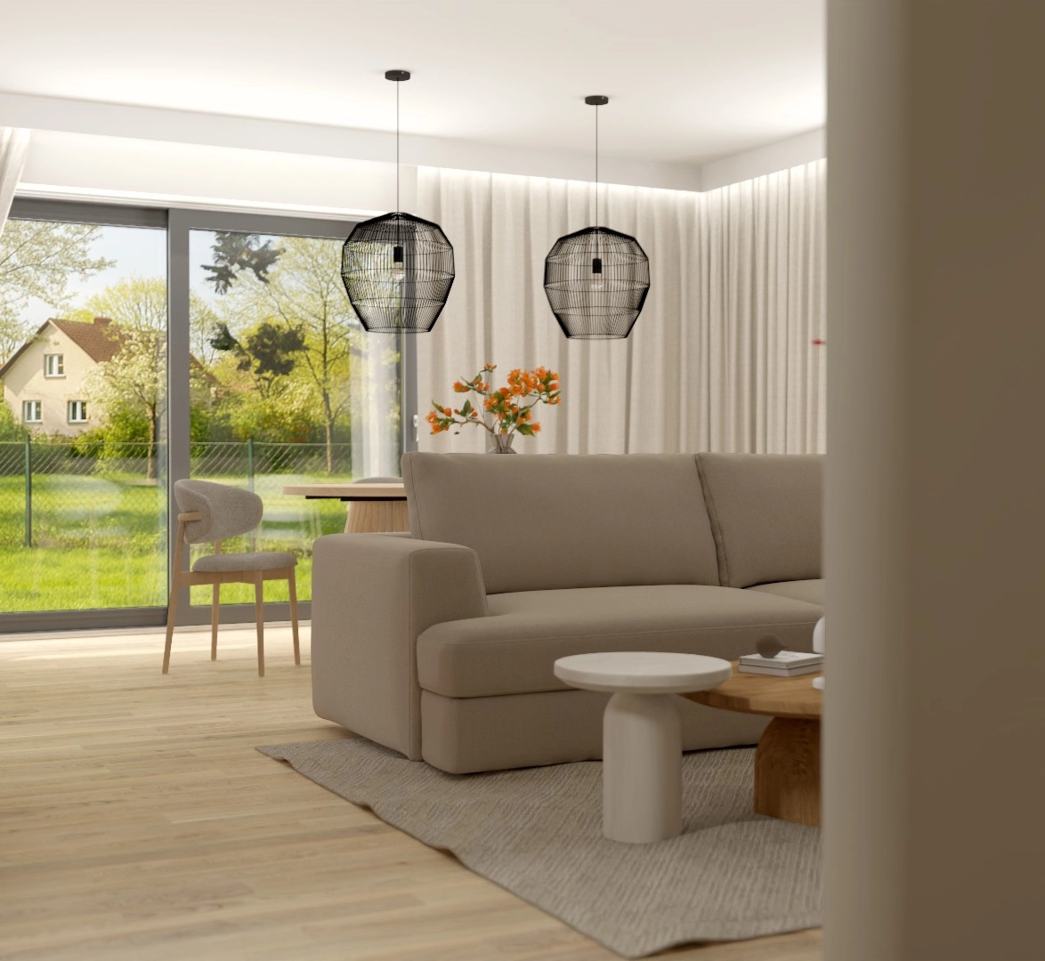 Brzozowy las zagląda przez okno kuchni, przez łazienkę i przez sypialnię z zielonymi zasłonami – i od razu wiadomo, że ten dom nie jest odcięty od tego, co na zewnątrz. Szałwiowa zieleń na ścianach, w meblach i w detalach spaja całość od wejścia po poddasze. Jedynym wyjątkiem jest gabinet właściciela – czarna ściana, industrialne półki i skupienie, które mówi samo za siebie. Dom, który oddycha – razem z ogrodem.