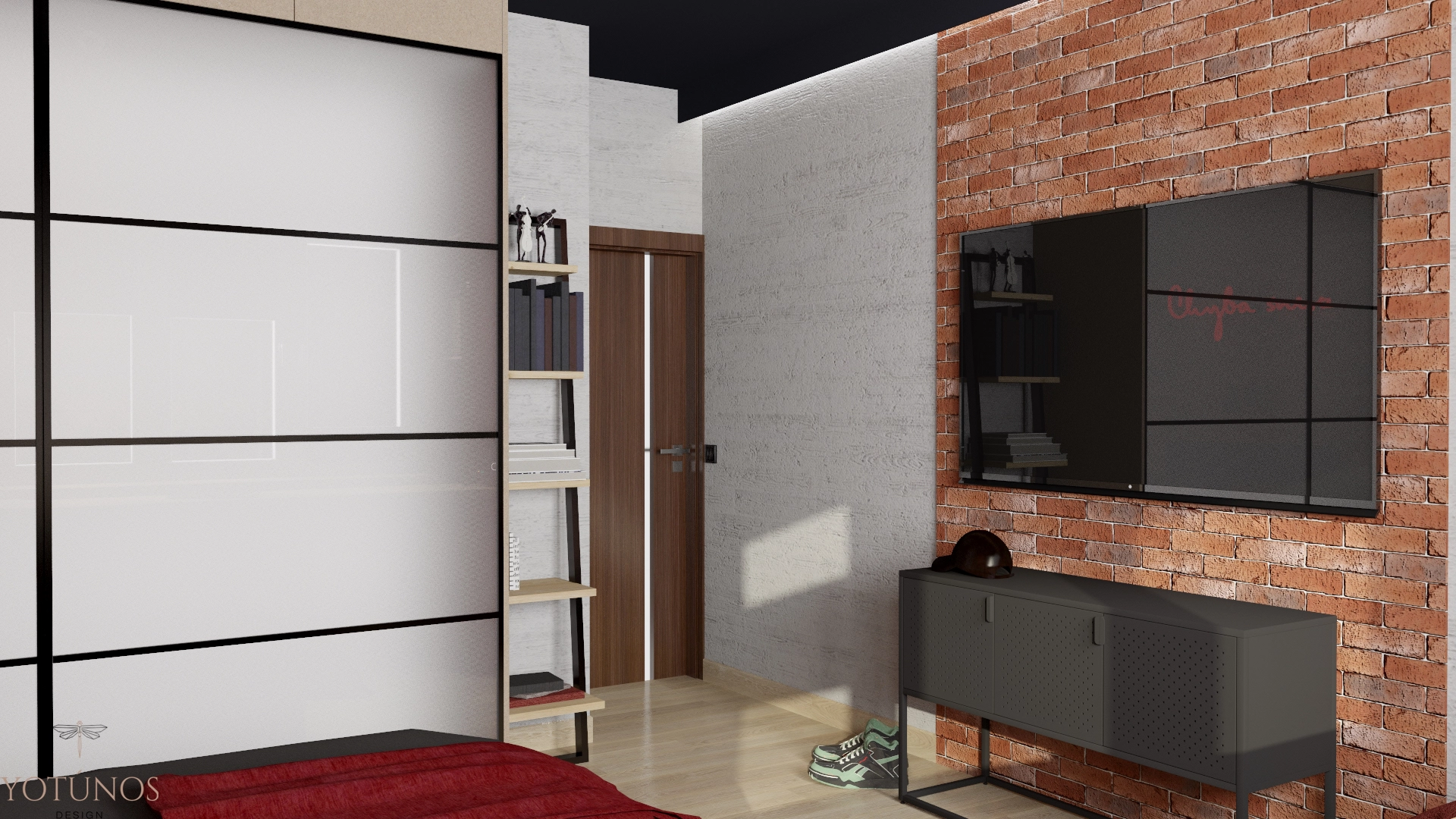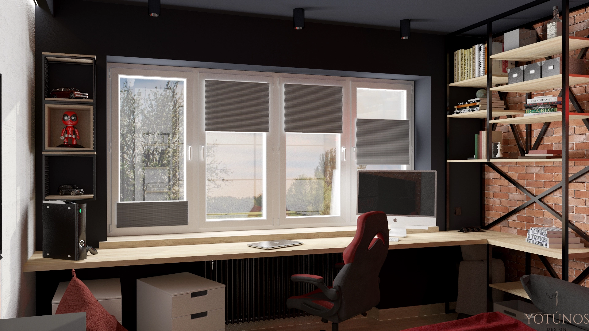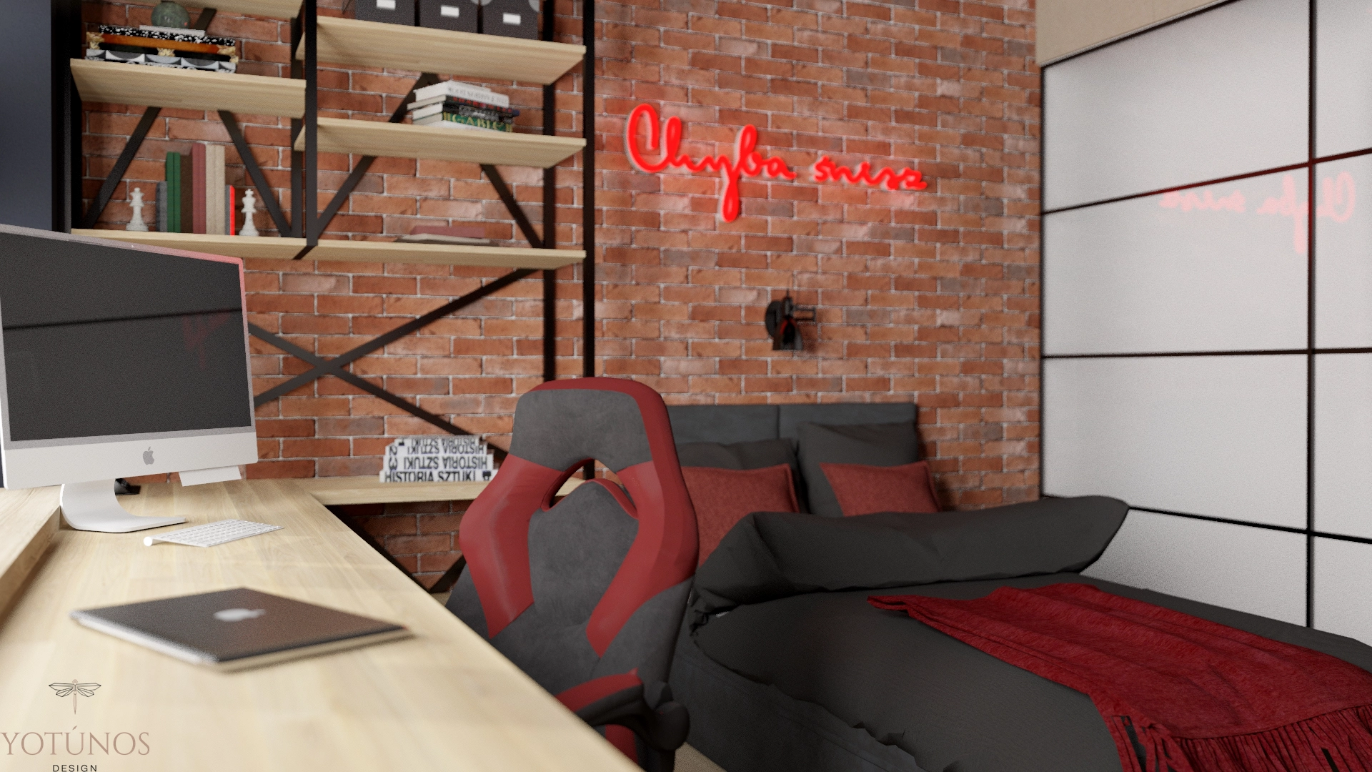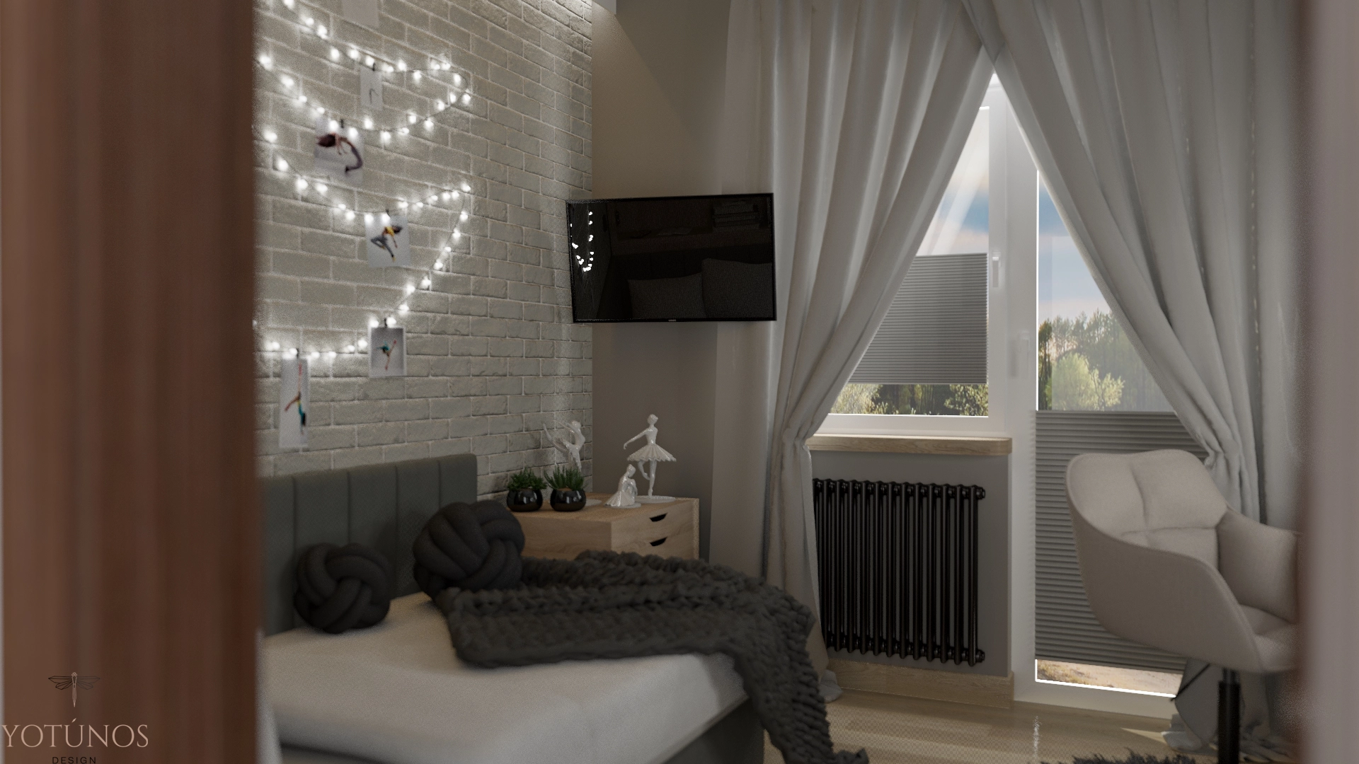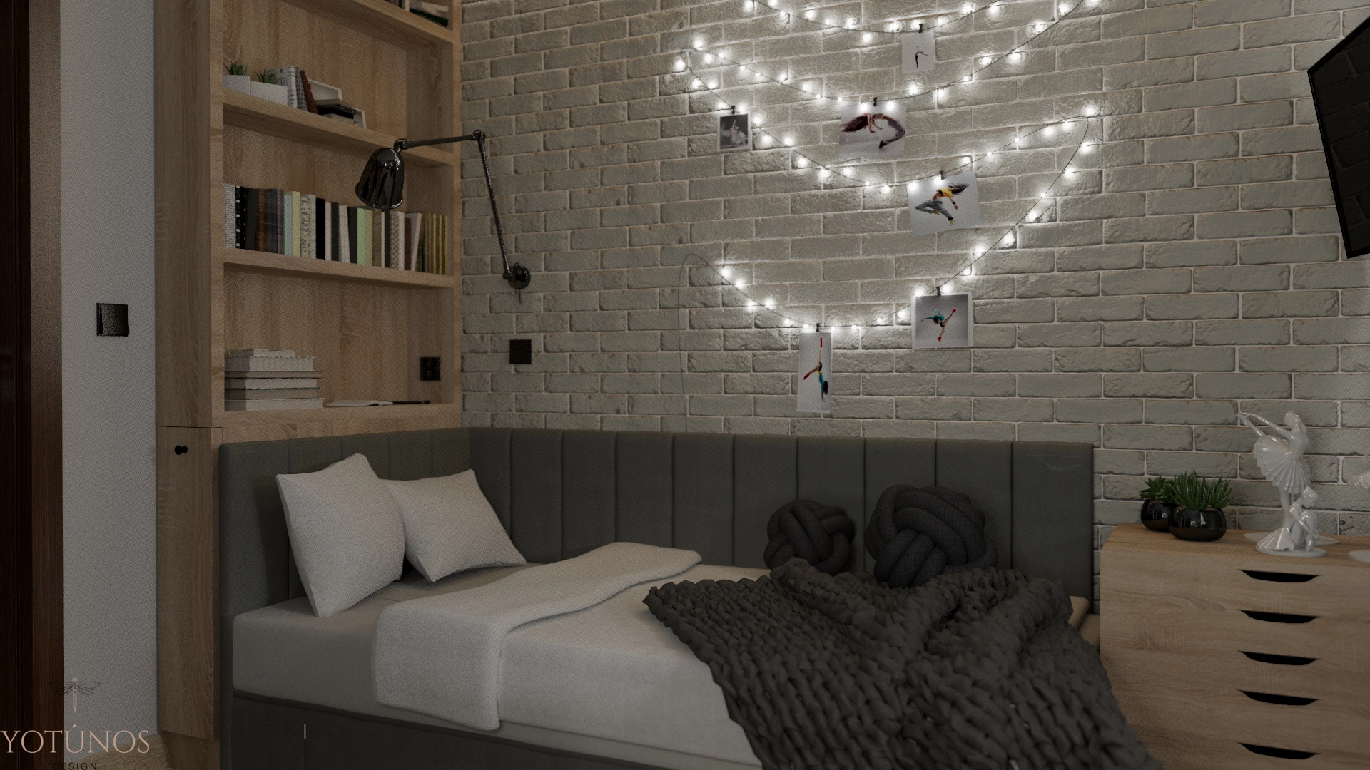 Industrialna kuchnia z betonowym pasem i drewnianymi frontami, minimalistyczna łazienka z czarną armaturą, pokój syna rodem z miejskiego loftu i pokój córki z białą cegłą i girlandą świateł. Projekt, który mógł być niespójny – a jest zaskakująco spójny. Dom, który zna swoich mieszkańców.