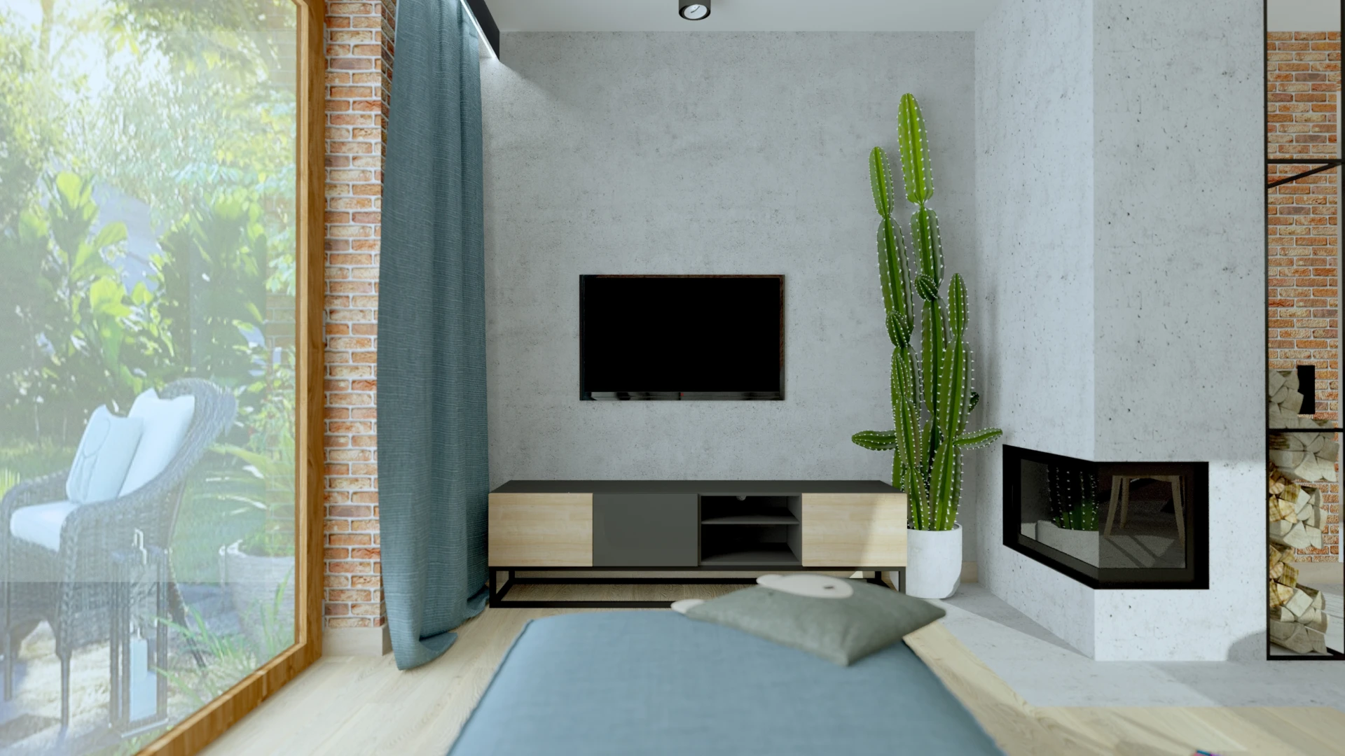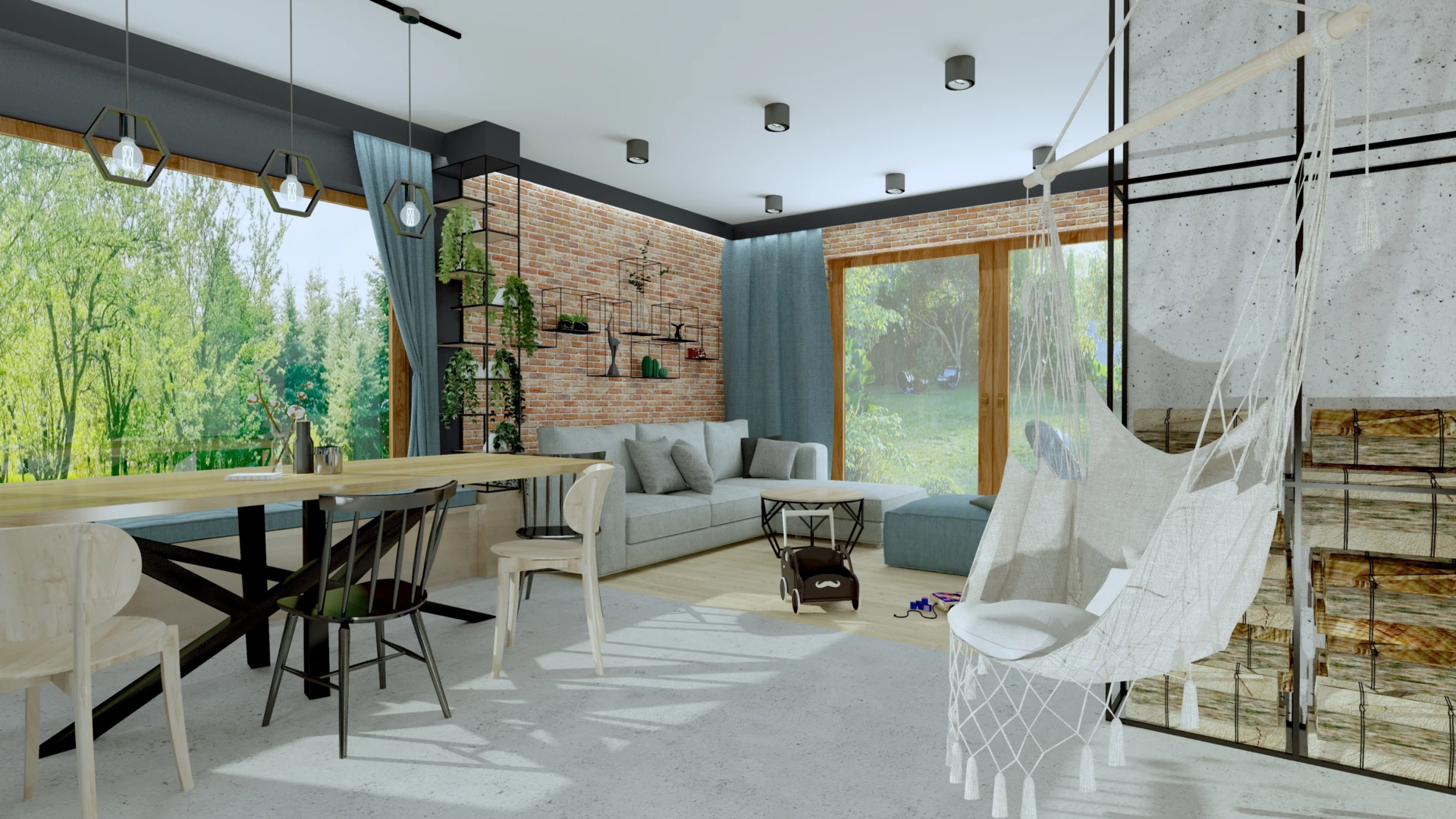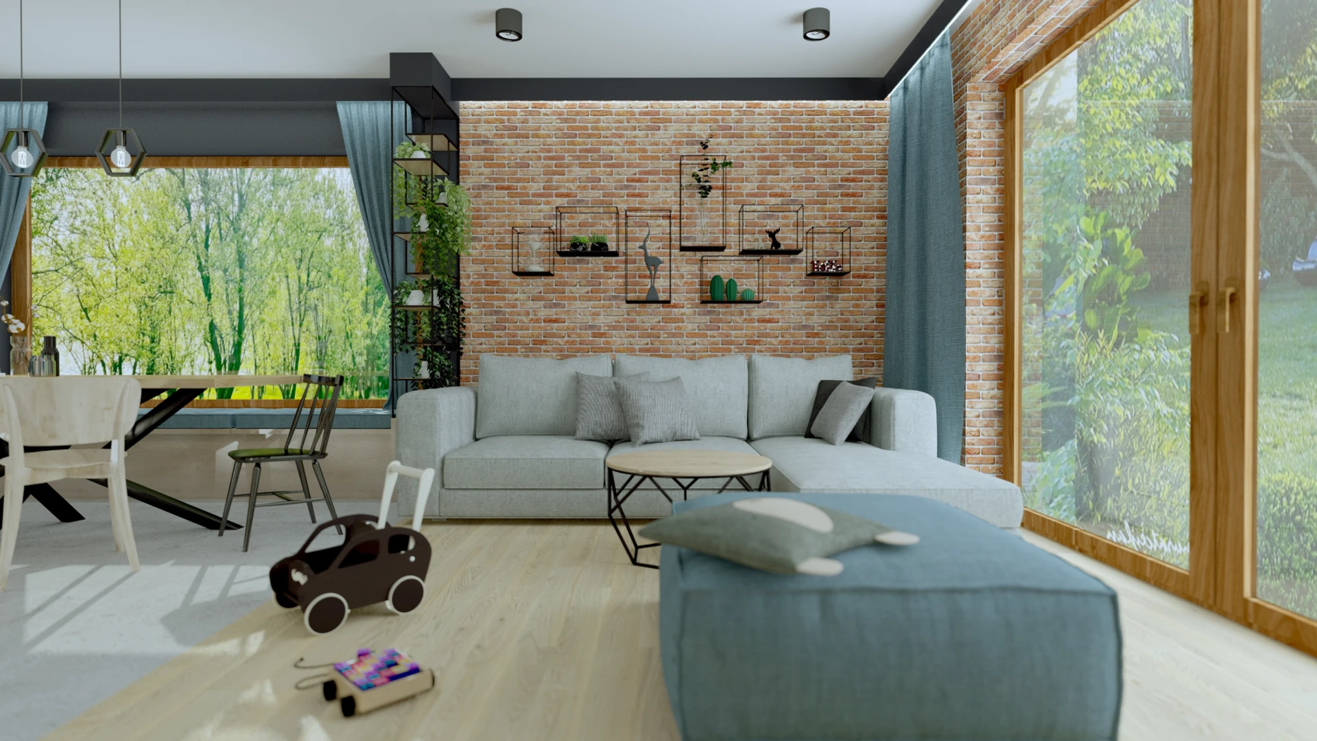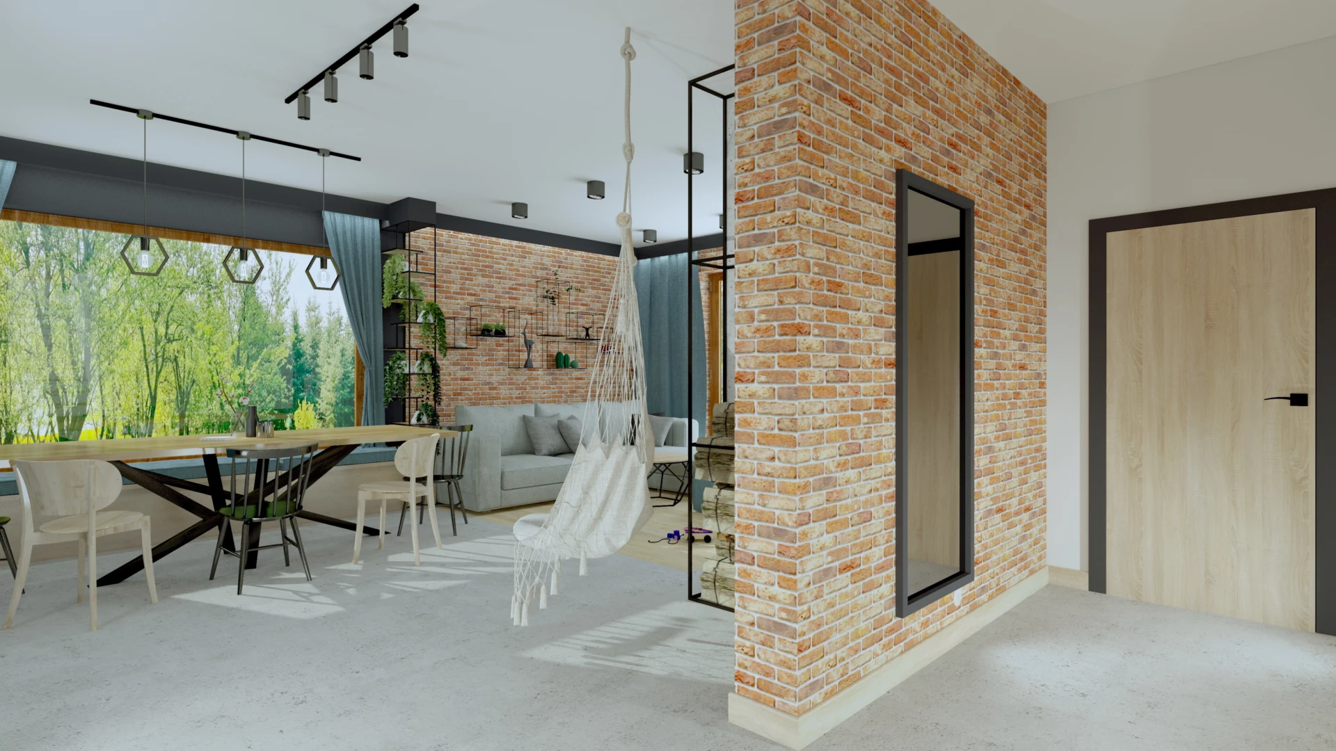 Dom zaprojektowany z myślą o dużej, aktywnej rodzinie, gdzie każdy znalazł swoją przestrzeń. Zieleń wkracza tu dosłownie – przez wielkie przeszklenia, leśną tapetę w sypialni i rośliny w każdym kącie. Styl soft loft łączy surowe materiały – cegłę, drewno i czarne detale – z ciepłem rodzinnego domu, tworząc przestrzeń, która oddycha razem z ogrodem.