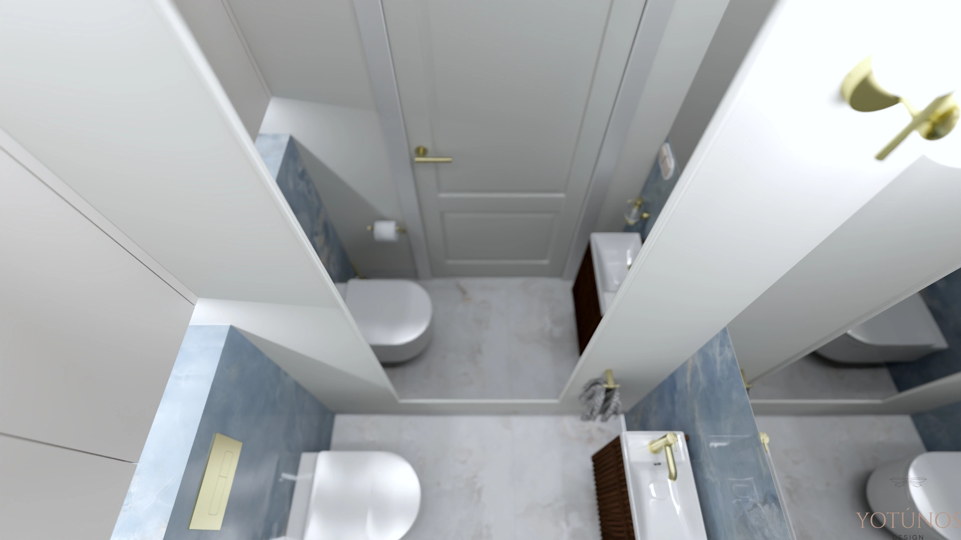 Granat pojawia się tu stopniowo – w poduszkach jadalni, w ryflowanej wyspie, w ścianie sypialni, w kafelkach łazienki. Złoto go prowadzi: uchwyty, armatura, lustra, listwa przy wyspie. Ciemny orzech go ociepla. Razem tworzą mieszkanie, które ma w sobie i elegancję, i charakter.