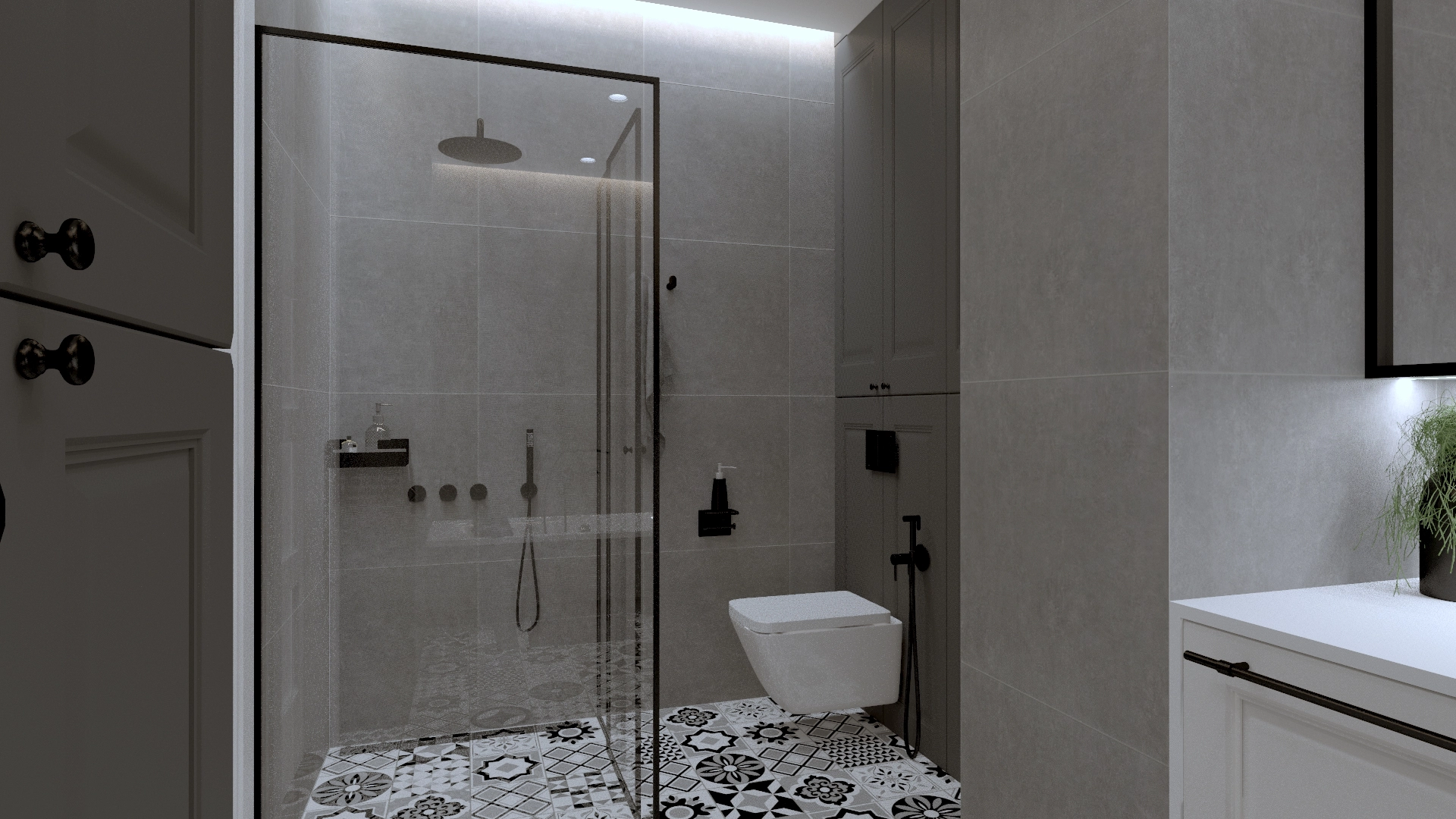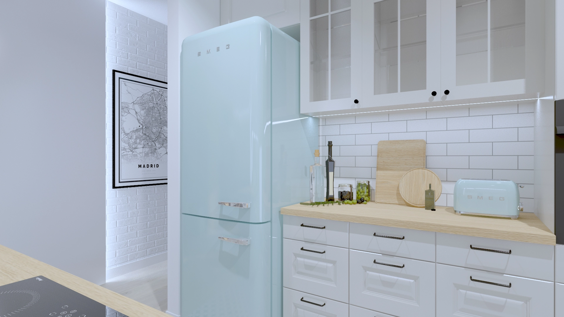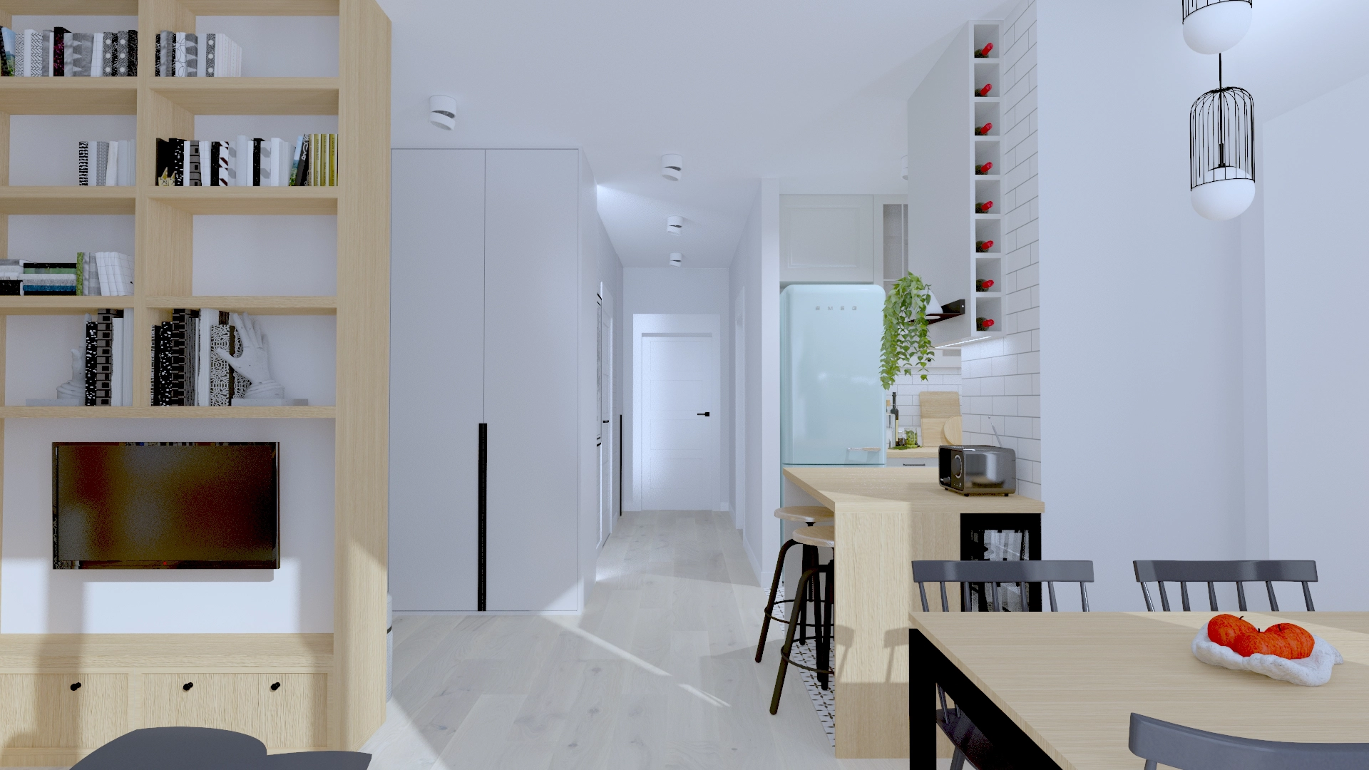 Biała baza, miętowy akcent i ściana pełna książek – i już wiesz, że tu ktoś mieszka z charakterem. Kuchnia z retro lodówką i wzorzystą podłogą, salon z imponującą biblioteczką z drewna, łazienka z patchworkową posadzką i industrialnym klimatem. Żoliborz z miętą w tle – i ani jednym zbędnym elementem.